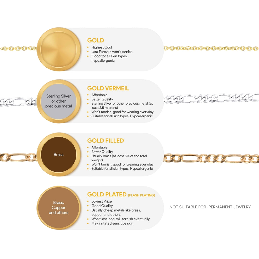 | Gold Plated | Lowest Price | Short-Term Durability | Cheap metals like brass or copper | Affordable, stylish option for fashion pieces | Chips and tarnishes easily; unsuitable for daily wear; may irritate skin |